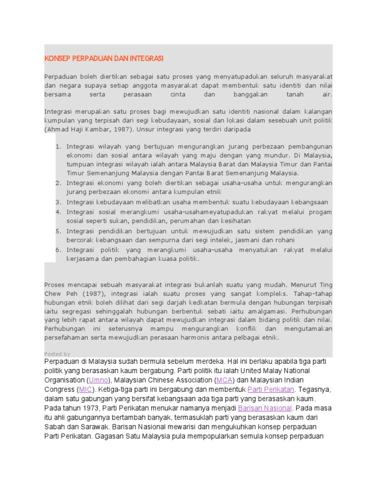 Konsep Perpaduan Dan Integrasi from imgv2-2-f.scribdassets.com Ringkasnya perpaduan dan integrasi nasional adalah matlamat asas baginagara. Jabatan perpaduan negara dan integrasi nasional. Ringkasnya, perpaduan dan integrasi nasional adalah matlamat asas bagi negara malaysia. Menurut ting chew peh (1987), proses mencapai sebuah masyarakat integrasi bukanlah sesuatu yang mudah. Kejelekitan perpaduan dan integrasi rakyat dalam sebuah negara berbilang kaum sukar dicapai tanpa pendedahan awal yang berstrategik, keintiman, persefahaman semua pihak, kepercayaan dan pegangan kukuh terhadap ajaran agama, di samping menghayati dengan penuh keinsafan intipati dan kandungan tersurat dan yang tersirat dalam kesemua prinsip rukun negara.penghayatan rukun negara untuk mencapai perpaduan dan integrasi nasional yang padu lagi jitu dilaksanakan di negara ini melalui proses. Memperkenalkan konsep satu malaysia melalui pendidikan antara langkah2 untuk mengatasi masalah yang wujud dalam usaha mewujudkan perpaduan sosial ekonomi kebudayaan sistem persekolahan yang sama bagi semua bahasa Perpaduan dan integrasi halangan2 dalam memupuk perpaduan. Integrasipula melibatkan semua penyatuan di atas, termasuk aspek biologikal.